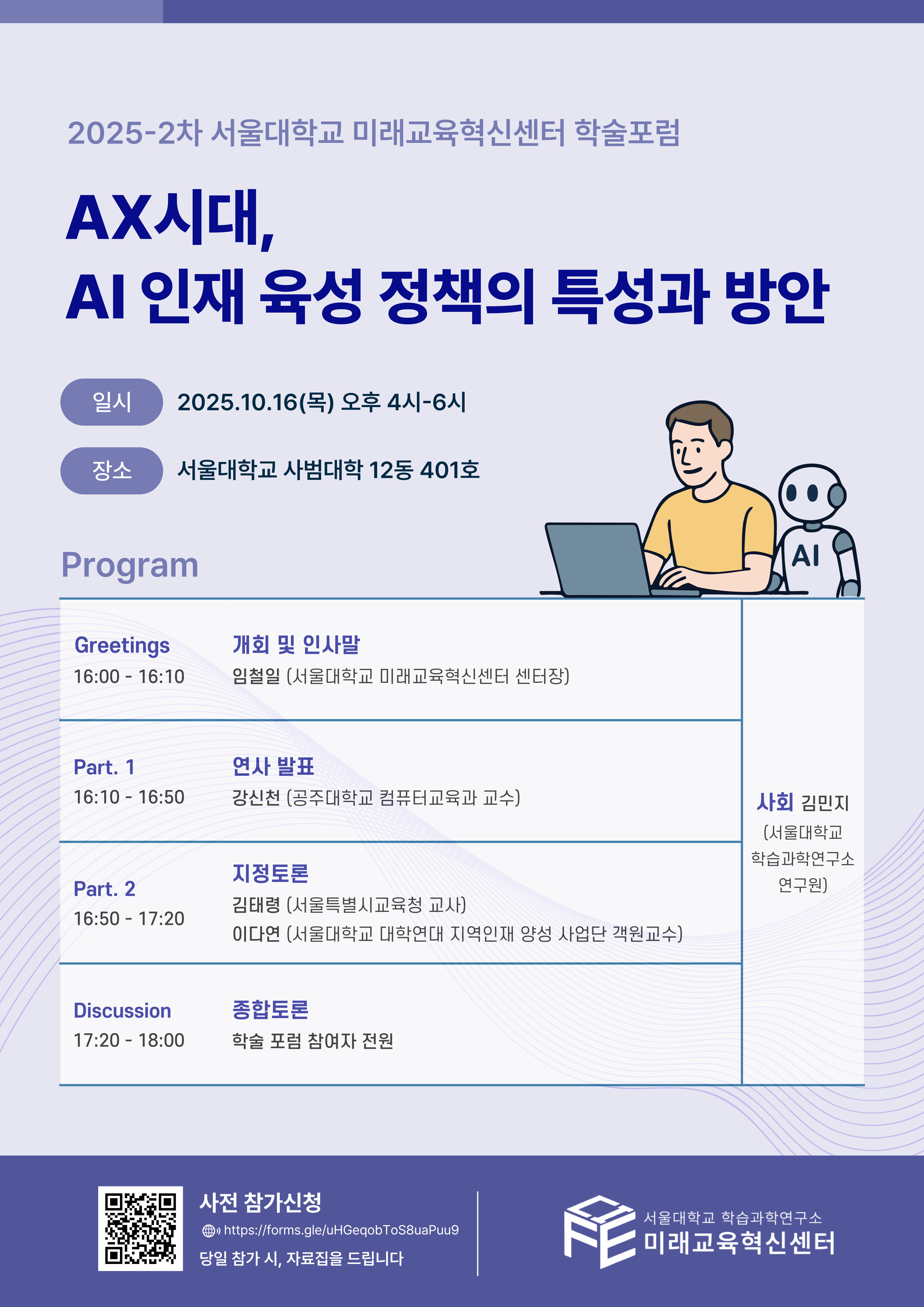 서울대학교 사범대학 학습과학연구소 미래교육혁신센터에서는 「AX시대, AI 인재 육성 정책의 특성과 방안」이라는 주제로 2025년 2차 학술포럼을 개최합니다.